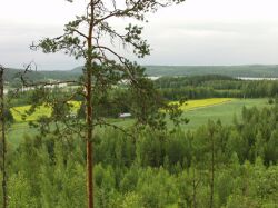 Näkymä Kettuvuorelta länteen. Suoraan edessä keltainen rypsipelto ja taempana Ylisjärvi.