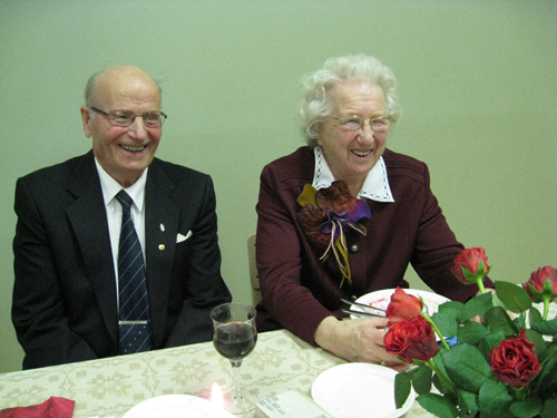 Nykyisin Korpilahden kirkonkylässä asuva pariskunta ei ollut valinnut juhlien pitopaikkaa sattumalta, liittyyhän vanha koulutalo kultahääparin elämänvaiheisiin monin tavoin. Aikanaan koulun rakensi Reinon isä, Kalle Koskinen. Reino totesikin omassa puheessaan, että hän lähes aistii isän tuoksun vielä leijailevan luokkahuoneissa. Myöhemmin omat lapset kävivät tätä koulua ja loppuvaiheessa koulu on toiminut kyläläisten, myös Kirstin ja Reinon harrastuspaikkana. Kultahääpari muisteli elämänsä kulkua ja yhteistä taivalta. 50 vuoteen mahtuu kaikenlaista ja ehkä vähän hämmästyneenäkin pari totesi, että kaikesta on selvitty. Talo saatiin aikanaan valmiiksi, rakennusaikaiset velat maksettua, työtä tehtiin, lapset saatiin kasvatettua ja lähetettyä maailmalle. Kiirettä ja touhua riitti. Mutta pariskunnan puheista kuulsi ennen kaikkea kiitollisuus eletystä elämästä, joten heidän yhteislaulukseen valitsemaansa virteen ”Kiitos sulle Jumalani, armostasi kaikesta, jota elinaikanani olen saanut tuntea” oli helppo yhtyä. Juhlissa ruokailtiin, laulettiin, kuultiin lauluesityksiä, visailtiin ja kisailtiin. Hauskassa Tuttu juttu-kisassa paljastui juhlavieraillekin, miten 50 vuotta yhteistä matkaa hioo parin yhteen. 20 kysymyksestä pari ansaitsi 16 tulppaania vakuudeksi samanmielisestä vastauksesta. Ja löysihän pari toisensa sokkotestissä käsien ja säärien muodostakin, joten vielä on muodotkin muistissa. Leikkimielisessä muistelutietokisassa palattiin 50 vuoden taakse ja aiheina olivat niin missit kuin silloiset iskelmätähdetkin. Koska ilmastonmuutos on nykypäivän sana, niin parilta tentattiin vihkipäivän 13.12.1958 säätilaa. Sen verran pariskunta oli ilmeisesti kyseisenä päivänä rakkaudesta ja onnesta sekaisin, ettei säästä ollut minkäänlaista muistikuvaa. Mutta Reino totesi, ettei silloin ainakaan mitään poikkeusolosuhteita, paukkupakkasia eikä kovia lumimyräköitä ollut, koska rovasti Olanterä kotitaloon Lähteenmäkeen pääsi ajallaan. Mutta todennäköisesti lunta oli ollut enemmän kuin nyt kultahääpäivänä, jolloin maassa oli vain aavistus lunta ja mittari juuri ja juuri pakkasen puolella. Hääkakkua kultahääpari leikkasi yhdessä niin kuin 50 vuotta sitten ja taisi siinä Kirsti putkilahtelaisena ”väkevänä vaimona” polkaista itsellensä määräysvallan tulevien vuosien vakuudeksi. Kultahääpari saa jatkaa yhä yhteistä matkaa ja toivon mukaan yhtä virkeinä ja aktiivisina kuin tähänkin asti. Mukavaa oli ja Kirsti totesikin, että täällä on niin hauskaa, että tällaisia juhlia voi pitää jatkossakin. Joten jäämme odottelemaan pariskunnan timanttihäitä.