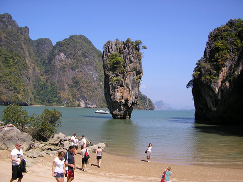 Ensimmäinen aamu valkenee hieman pilvisenä, mutta hikoiluttavan kuumana Surat Thanissa. Astumme 5-7 hengen pitkähäntäveneisiin, ja suuntaamme ajelulle sokkeloiselle Tapi-joelle. Jokiuoma mutkittelee rehevässä viidakkomaisessa ympäristössä, paikalliset asukkaat ihmettelevät valkoihoisia matkalaisia rähjäisissä veneissä. Yksi veneistä hieman vuotaakin, mutta kuljettaja kauhoo vettä veneen pohjalta naureskellen, ja matka jatkuu. Pelastusliivejä ei tässä kaupungissa ilmeisesti tunneta ollenkaan. Pian pysähdymme apinankoulutusfarmille tutustumaan, kuinka apinoita opetetaan keräämään kookospähkinöitä korkeista palmuista. Vasta 2-vuotias nuorukainen harjoittelee vielä rautatankoon kiinnitetyillä kookoksilla, mutta 7-vuotias Charlie-apina tekee kuuden tunnin työpäiviä pudotellen pähkinöitä alas puusta, toki välillä on myös lepopäiviä, ja palkka tulee herkkujen muodossa. Saimme myös maistaa tuoretta kookosvettä suoraan pähkinän sisältä pillillä. Charlie osaa myös poseerata, jotta saadaan hyvät valokuvat muistoksi. Jätämme apinat opiskelemaan, matkaamme takaisin satamaan ja sieltä bussilla kohti Nakhon Sri Thammaratia. Vierailemme vielä buddhalaisessa pyhiinvaellustemppelissä, jossa kymmenet, ellei sadat kultaiset buddhapatsaat luovat tarunomaista tunnelmaa. Munkit oransseissa kaavuissaan suorittavat askareitaan turisteista välittämättä. Illalla väsyneinä majoittaudumme kaupungin parhaaseen hotelliin. Aamulla ajamme bussilla pari tuntia etelään pitkin Siaminlahden rannikkoa ja pysähdymme pieneen kalastajakylään. Nousemme taas pitkähäntäveneisiin ajelulle Thale Noi -järvelle. Veden pinnalla kelluu vaaleanpunaisia ja valkoisia lootuskukkia, moninaiset linnut kiertelevät veneen ympärillä ja vesipuhvelit laiduntavat laumoina rannan tuntumassa. Vaikkakin päivä oli pilvipoutainen, huomaamme iltapäivällä hotellin uima-altaalla, että useimmilla iho hehkuu punaisen eri sävyissä. Tähän kun vielä lisätään Etelä-Thaimaalle ominaiset, todella mausteiset ruuat, hikipisarat kostuttavat itse kunkin otsaa ja kainaloita. Seuraavat kaksi yötä vietämme Trangin kaupungissa, missä on nähtävissä paljon kiinalaisia vaikutteita, sinne muuttaneiden kiinalaisten myötä. Aamulla ajammekin jo Thaimaan länsirannalle, ja jatkamme isolla kalastusaluksella Andamaaninenmeren rannikolle. Jyrkkäseinäiset kalkkikivivuoret kohoavat jylhinä turkoosista merestä, meduusat uivat laivan vierellä, ja värikkäitä kaloja voi ihastella vain laivasta katsomalla. Aivan uusi maailma avautuu kun pysähdymme erään saaren suojaan snorklaamaan. Kalojen seassa polskutellessa ei huomaa ajan kulumista, kun meren pohjaa koristavat meritähdet, piikikkäät merisiilit ja monenmuotoiset korallit, polttavaa meduusaa piti kuitenkin muistaa varoa. Snorklaamisen jälkeen nautimme lounaan kalastusaluksella. Ajelemme auringosta nauttien oikean paratiisisaaren rantaan; vesi on smaragdinvihreää, hiekka pehmeää, eikä muita turisteja ole näkyvissä. Ennen rantautumista ja uimista aluksemme ajaa vahingossa upoksissa olleeseen poijuun, poijun naru tarttuu potkurin ympärille ja matkanteko katkeaa toviksi. Onneksemme mukana on pari sukeltajapoikaa, jotka käyvät selvittämässä sotkun potkurista ja matka pääsee turvallisesti jatkumaan. Meripäivän ohjelmaan kuuluu vielä uinti noin 50m pitkän säkkipimeän kalkkikiviluolan läpi kallioiden keskellä olevalle keitaalle. On jännittävää lipua jonossa pimeässä, minimissään 1,5m korkeassa luolassa sukeltajien näyttäessä taskulampulla uintisuuntaa, äänet kaikuivat pimeydessä aavemaisesti. Ikimuistoisen päivän jälkeen palaamme hotellille syömään ja lepäämään. Aamulla jatkamme matkaa Trangista Krabille, joka on jo pitkään ollut myös suomalaisten rantalomailijoiden suosiossa. Aamua synkistää hieman se, että viidellä matkalaisista on yön aikana ilmennyt vatsataudin oireita, mutta onneksi paikalliset lääkkeet tehosivat hyvin, ja matkaa päästään jatkamaan suunnitelmien mukaan. Matkalla pysähdymme buddhalaistemppelissä, joka on sekoitus thaimaalaista ja kiinalaista arkkitehtuuria. Temppelin ympäristössä asuvat apinat viihdyttävät tempuillaan ja maistelevat niille ostettuja pikkubanaaneja. Yksi apina tekee kepposen varastamalla oppaamme upouuden kengän, ja Anita saa avokkaansa takaisin ylimääräisellä ilmastointikololla varustettuna. Krabiin saavuttuamme on mahdollisuus lähteä viettämään iltapäivää Ao Nangin kuuluisalle hiekkarannalle. Itse jään toipumaan vatsataudista hotellin uimaltaalle. Seuraavana aamuna jatkamme bussimatkaa Krabista pohjoiseen parin tunnin verran. Bussin ikkunoista näemme laajoja kumipuuviljelmiä, öljypalmuistutuksia, riisipeltoja ja paikallisia pikkuisia kyliä, joissa markkinatorit kuhisevat ihmisiä. Pysähdymme eräälle torille kiertelemään ja haistelemaan tunnelmia. Myyjät ovat lähinnä vanhoja naisia, jotka istuvat huivi päässä kojunsa perukoilla. Tarjolla on kymmeniä erilaisia hedelmiä, joista suurin osa on vieraita meille suomalaisille. Oppaamme ostaa muutamia hedelmiä maistiaisiksi. Auringonpaisteessa ”marinoituvat” myös lihavartaat, kissakalat, ravut ja muut merenelävät, valitettavasti turistin vatsa ei taitaisi kestää moisia herkkuja. Toripysähdyksen jälkeen nousemme suureen pitkähäntäveneeseen pumpulitupot korvissa (moottorin ääni on melkoisen kova), ja päristelemme Phang Ngan lahdelle sokkeloisten mangrovepensassaarekkeiden seassa. Poikkeamme James Bondin saarelle, joka on saanut nimensä siitä, kun Kultainen ase -elokuva kuvattiin siellä. Paikka on varsinainen turistihoukutin. Rannalla kelluu toinen toistaan hienompia luksusveneitä ja pitkähäntäveneet tuovat tasaiseen tahtiin porukkaa saarelle, ja rihkamamyyjät kauppaavat kilvan tavaroitaan ylikalliilla hinnoilla. Saari sinänsä on maisemiltaan hieno ja näkemisen arvoinen paikka. Jatkamme veneellä kohti merimustalaisiksi kutsuttujen 
