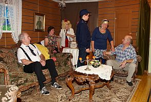 Vauhdikkaassa esityksessä näimme monenmoista henkilöä, kuten kosmetoligin, poliisin, kangasniemeläisiä sukulaisia ja taideväärentäjän.(Näytelmä on nähtävissä uudestaan 7.7.2012 Seuralassa.) Tämän jälkeen alkoi vapaampi seuranpito. Buffetista sai pientä iltapurtavaa nälkäisille ja tanssittamisesta huolehti Pentti Könnön yhtye solistinaan Antti Sorsa. Myös ulkona oli väkeä juttelemassa ja tapaamassa tuttuja. Illanvietto jatkui rattoisasti yömyöhään.